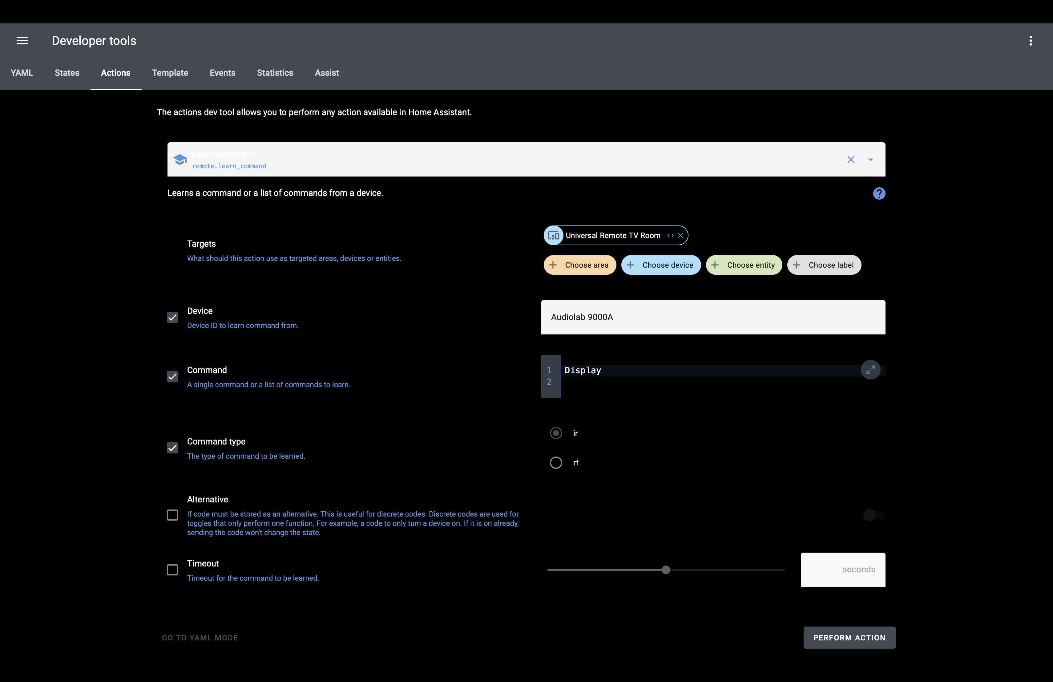 If I could call the ‘remote.send.command’ with the right parameters then that might be a good solution to the problem, at least for those using HA/Broadlink. (Which, admittedly, may be a small number but at least provides another option…)