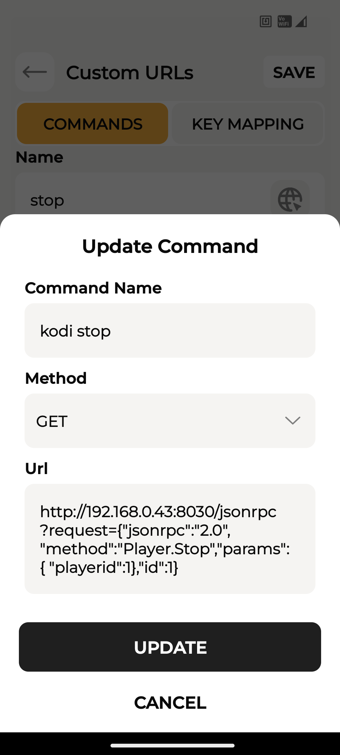 Trying to make a stop button for Kodi with custom URL and having no luck